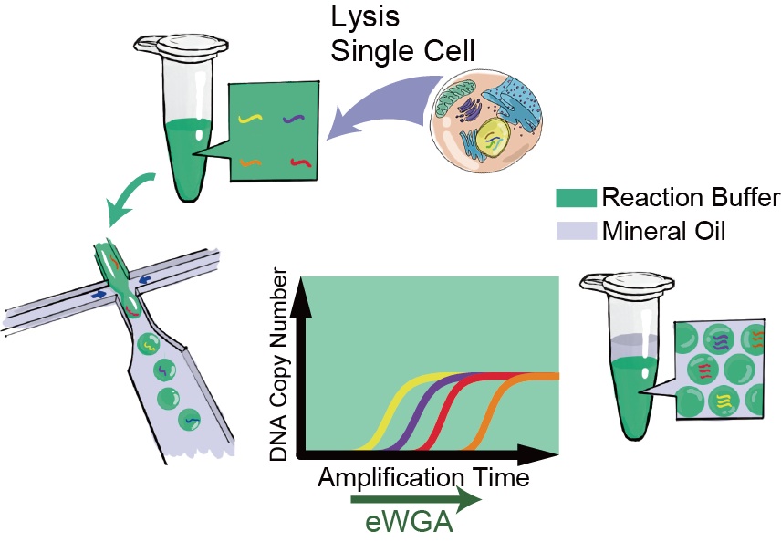 eWGA elegantly solves this problem by combining microfluidic technology with isothermal amplification chemistry. The genomic DNA of a single cell was evenly divided into nearly a million separated fractions, each of which was confined as a pico-liter aqueous droplets in oil. Each droplet contains around one DNA fragment along with the reagent for multiple displacement amplification (MDA) reaction. Although the reaction rate is not the same between droplets, the final amplification yield will be the same after each droplet-reaction reaches saturation. eWGA inherits the low error rate of MDA technology using high-fidelity polymerase, while extraordinarily suppresses amplification bias, the notorious characteristic associated with MDA. The result shows that eWGA is able to accurately detect small CNVs without inter-sample correction, and to probe high confidence SNVs simultaneously. eWGA can be used to identify CNVs in single tumor cells with the highest resolution around 250kb. Besides, eMDA is compatible with targeted enrichment methods such as exome capture. The overall performance of eWGA makes it an ideal choice for single cell whole genome amplification.