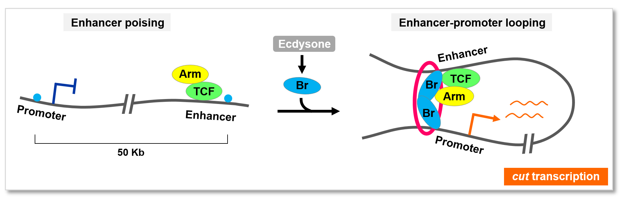 Intriguingly, this work found that the temporal and spatial signals triggering this natural lineage reprogramming event likely intersect through an unexpected chromatin looping mechanism. That is, the temporal factor not only form protein complex with the spatial factor, but also bridges two important yet far-away DNA regulatory sequences, called promoter and enhancer, of cut gene together via self-association, inducing cut gene activation. This mechanism might represent a new and general paradigm governing cell fate or identity switch with high precision in space and time, and has promising implications for the development of regenerative medicine strategies.