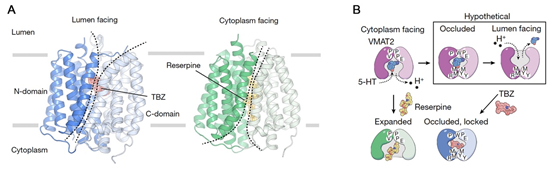 Mechanisms of neurotransmitter transport and drug inhibition in human VMAT2