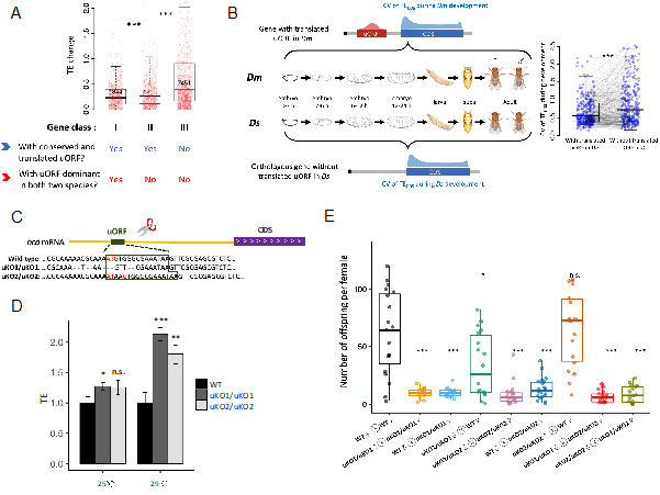 Upstream open reading frames buffer translational variability during Drosophila evolution and development