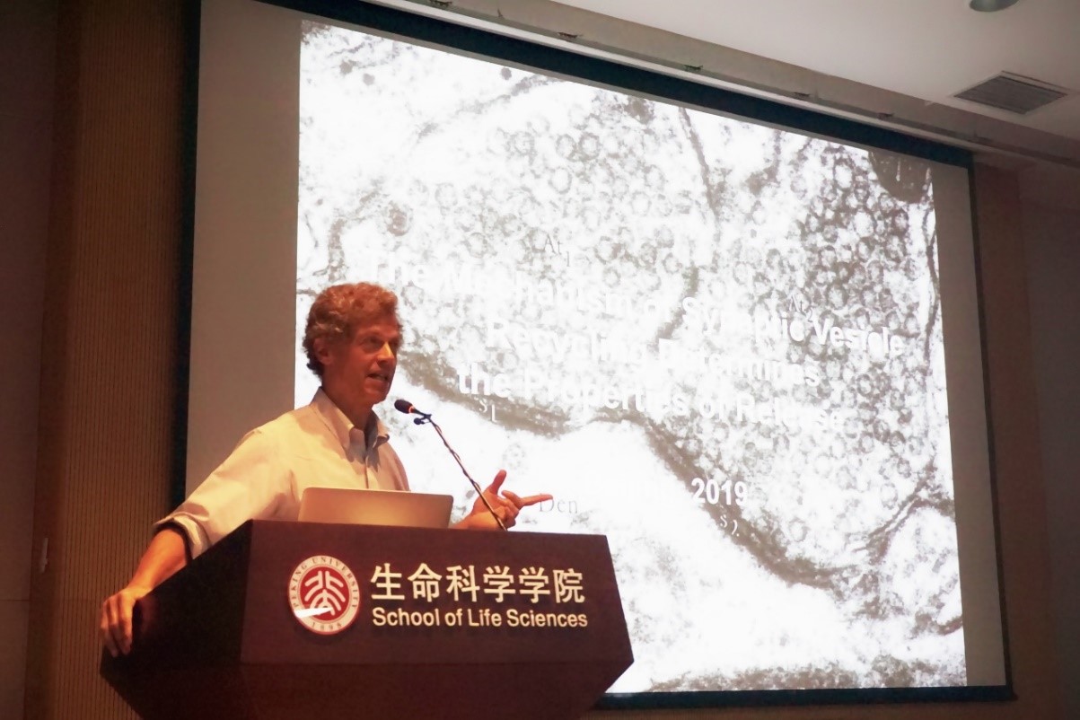 开幕式后,来自加州大学旧金山分校(University of California, San Francisco)的Robert Edwards教授作了题为“Endocytic Recycling Pathway Determines the Properties of Neurotransmitter Release”的学术报告。Robert Edwards教授选择中脑多巴胺神经元作为研究对象,发现其谷氨酸和多巴胺的突触小泡具有不同的短期动力学特征。进一步的研究表明,这两种神经递质与突触前Ca2+通道的偶联不同,两种突触小泡的形成也依赖于不同蛋白介导的内吞机制,从而完成对不同的信号的分选传输。