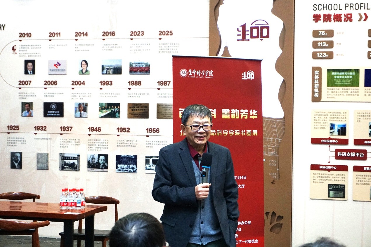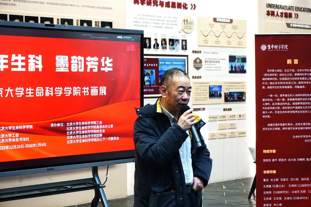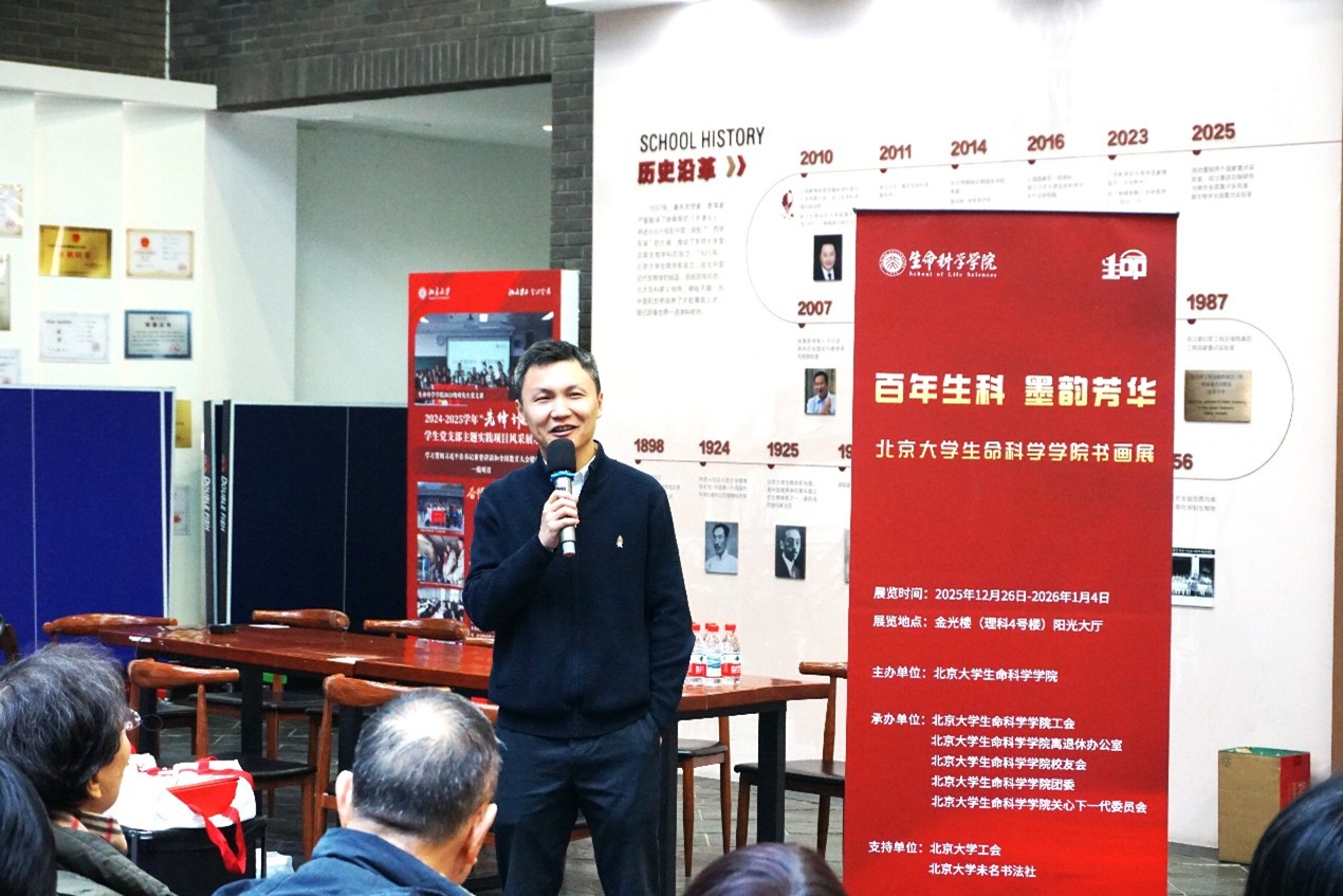 2025年12月26日,“百年生科·墨韵芳华”—冰球突破mg正规官网书画展在金光楼(理科四号楼)开幕。冰球突破mg正规官网工会常务副主席张宝岭,党委宣传部副部长唐平,工会副主席张小萌,工会原副主席、医学部工会原常务副主席刘穗燕,化学与分子工程学院教授、未名书法社社长、校友书画协会副会长沈兴海,工会文体部部长朱博雅,冰球突破mg正规官网院长陈雪梅,党委书记石长翼,中国科学院院士、冰球突破mg正规官网教授赵进东,党委副书记郑晓峰,党委副书记曲一铭,冰球突破mg正规官网工会副主席(兼)、冰球突破mg正规官网工会主席范六民,院长助理彭宜本,以及学院教师代表、离退休教师代表和学生代表等出席。