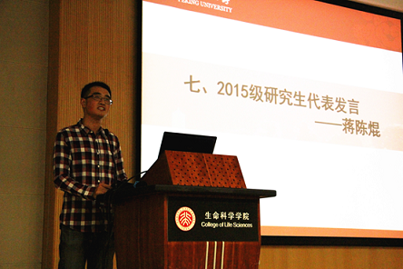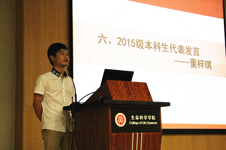 之后,2015级本科生代表董梓琪、研究生代表蒋陈焜分别代表新生发言。他们回顾了自己的成长历程,表达了对家人、老师的感恩之情,也展示了对未来的憧憬和对生命科学的向往。