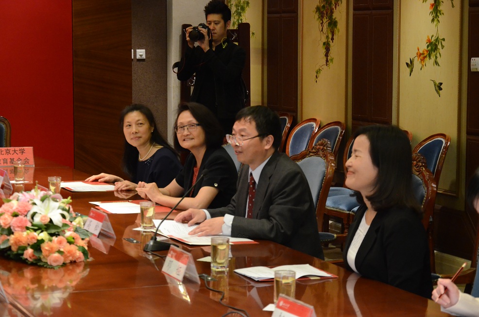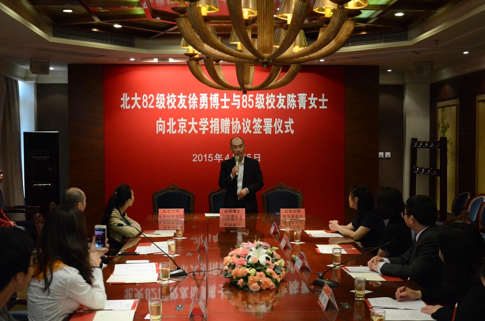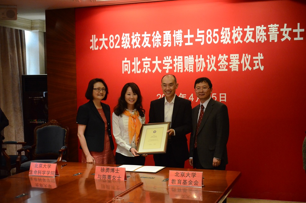 2015年4月25日上午,我院82级校友徐勇博士携夫人陈菁女士(我院85级校友)专程回到母校,向北大冰球突破mg正规官网捐赠1000万元设立億方高级人才基金。捐赠仪式在北大英杰交流中心星光厅隆重举行。出席捐赠仪式的有冰球突破mg正规官网副校长高松院士,冰球突破mg正规官网校长助理、北大教育基金会秘书长邓娅博士,冰球突破mg正规官网院长吴虹教授,院党委书记柴真教授。北大教育基金会拓展部部长赵琳,億方基金会副理事长陆景锴及冰球突破mg正规官网部分师生也参加了此次仪式。活动开始前,冰球突破mg正规官网林建华校长专门会见了徐勇、陈菁夫妇并进行了亲切交谈。