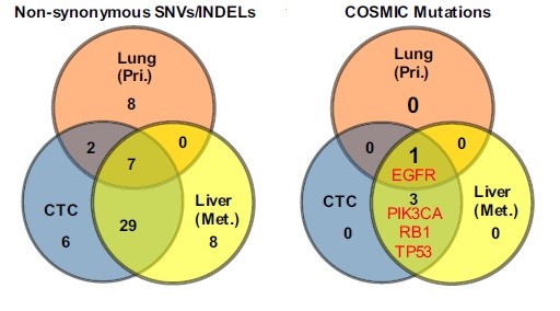 研究人员重点研究了肺癌患者外周血循环肿瘤细胞的分子特性。在来自众多肺腺癌患者和小细胞肺癌患者的循环肿瘤细胞中,成功检测到与癌症发生发展相关密切的原癌基因和抑癌基因上的重要单核苷酸变异和插入/缺失。单细胞水平CTCs的基因突变的检测避免了反复穿刺活检给病人带来的伤害和痛苦, 并能及时地提供个体化治疗所需的重要信息,例如导致癌症转移过程中发生表型转换的重要突变,以及癌症治疗过程中产生耐药性的重要突变。