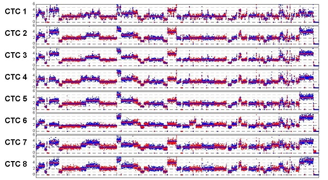 研究过程中研究人员意外地发现来自同一个病人的不同CTC都展现出高度一致的全基因组拷贝数变化模式,和同一病人的转移位肿瘤组织的拷贝数变化模式一致。这种现象在肺腺癌和小细胞肺癌的病人中都得到了验证。此外,在不同的肺腺癌病人中,CTC展现的全基因组拷贝数变化模式具有高度的相似性。肿瘤的异质性长期以来被当作是恶性肿瘤的重要特征。 首次在CTC中观察到的高度一致的拷贝数变异模式将会改变传统上对肿瘤异质性的理解,揭示了特定的拷贝数变异在肿瘤形成及转移中发挥了重要的作用。