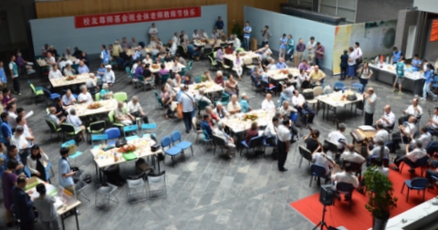 金色的九月,感恩的季节。在教师节和中秋节即将到来之际,冰球突破mg正规官网校友尊师基金于2013年9月8日在新生物楼举办了一场新颖别致的“和老师一起过节——教师节暨中秋节返校聚会”活动。九十二位离退休老师来到了新生物楼阳光大厅,三十五位校友赶到现场向恩师表达了节日的祝福。六位在职老师的参与以及在校同学的表演,都使得这个聚会倍添温馨。