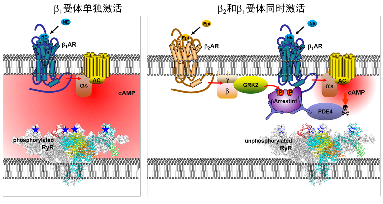 通过综合运用电生理、免疫电镜、细胞和分子生物学技术以及多种基因敲入和敲除模型,文章阐明,β2受体通过激活G蛋白耦联受体激酶GRK2,磷酸化了β1受体的C末端,使β1受体获得了通过βarrestin-1募集磷酸二酯酶PDE4的能力。PDE4通过降解cAMP,将原本可广域传播的β1-cAMP信号阻隔在纳米尺度的膜下微区之内。这样,虽然细胞膜钙通道依然被磷酸化,但cAMP信号却不能到达距细胞膜只有几纳米的钙释放通道RyR2的磷酸化位点,从而抑制了β1受体的正常信号转导(图2)。