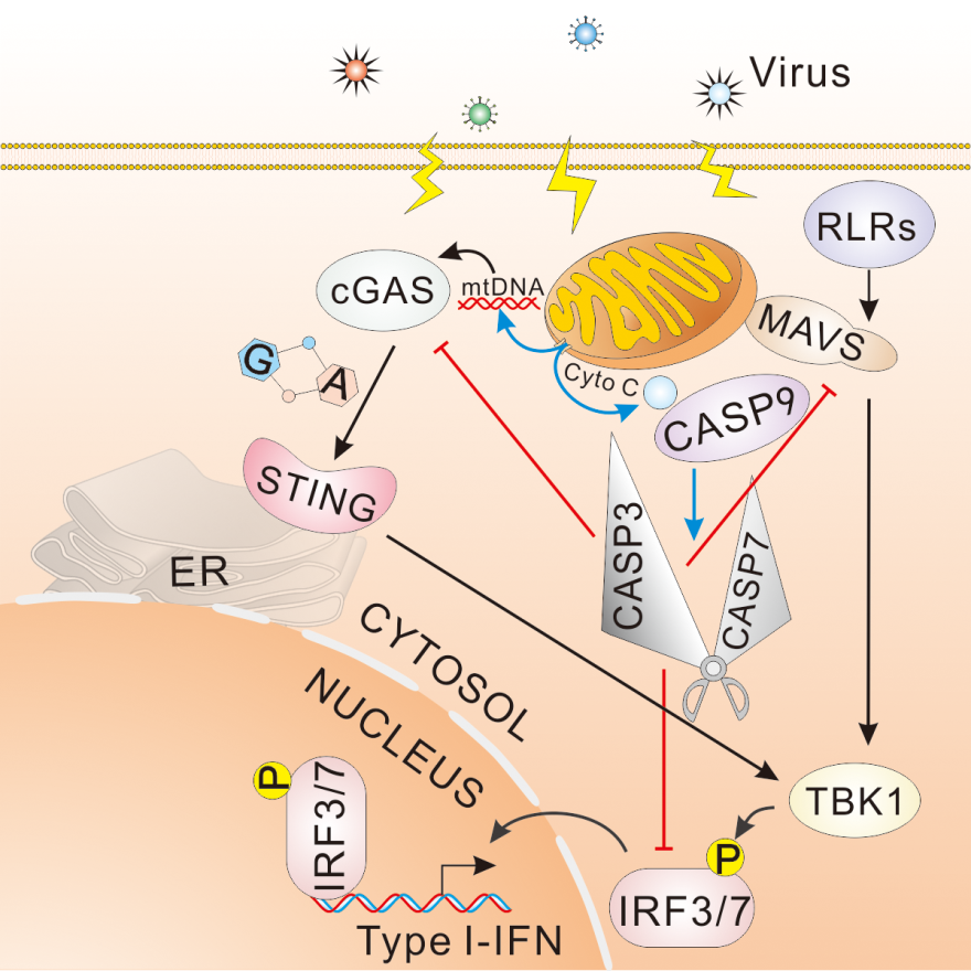 细胞凋亡在机体的生命进程中无时无刻不在发生。细胞凋亡在胚胎发育阶段清除多余的和已完成使命的细胞,如指/趾间结构去除和尾巴的消失,保证胚胎的正常发育;在成年个体中清除衰老和病变的细胞,如皮肤细胞的脱落和消化道细胞的更替、泌乳后乳腺的消退及免疫细胞的阳/阴性选择,维持器官细胞的动态平衡,保证机体的健康。这些随时都在发生的细胞凋亡与其它所有类型细胞死亡都不同的是:细胞凋亡不引起天然免疫的活化,即死亡细胞保持“天然免疫沉默”。这样的“免疫沉默”对于机体的正常生理活动是至关重要的。否则胚胎无法正常发育,而成年个体则会始终处于发炎状态。以往的多项研究表明,细胞凋亡过程中线粒体DNA(mtDNA)会伴随细胞色素c被释放到细胞质中,而这些胞质中的mtDNA会强烈激活cGAS-STING通路,产生I-型干扰素并导致炎症反应。因此,细胞凋亡如何维持“天然免疫沉默”是一个非常有意义的、悬而未决的科学问题。2014年,Richard Flavell团队及Benjamin Kile团队在《Cell》发表的两篇文章同时指出Apoptotic caspases在此过程中起关键作用,但是具体机制不清楚。蒋争凡课题组的上述发现表明,凋亡活化的Casp-3/-6/-7通过切割cGAS和IRF3有效阻断mtDNA诱导的cGAS-STING活化,进而避免I-型干扰素产生及炎症反应的发生。同时,切割MAVS和IRF3则能完全阻断RIG-I-MAVS介导的天然免疫活化。这些结果很好地解释了细胞凋亡如何保证“天然免疫沉默”这个重要的科学问题。