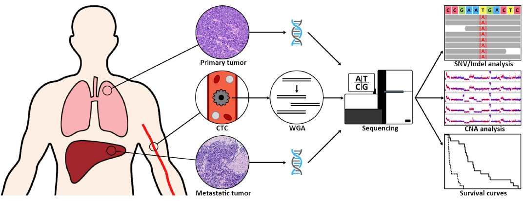 肺癌是世界上发病率最高的癌症,其中13%的肺癌患者被诊断为小细胞肺癌(SCLC)。SCLC是一种侵袭性极强,极易转移的恶性肿瘤。由于多数患者初治即为晚期,SCLC组织标本获取常常受限,探索通过替代标本进行SCLC基因分析是重要的研究方向。此外,对于治疗过程中SCLC基因组的演变规律的研究也极其有限。循环肿瘤细胞(CTC)是游离于癌症病人外周血中的肿瘤细胞,通过CTC进行单细胞基因检测,是对SCLC病人基因变异及疾病进展进行监控的一种有效方式。