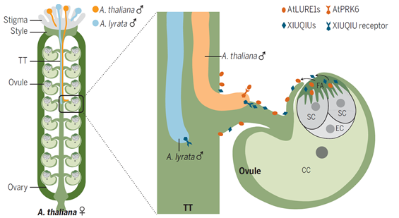 拟南芥AtLURE1s-PRK6小肽受体信号通路通过特异吸引自身花粉管穿出隔膜的作用,促进A. thaliana与近缘种A. lyrata的遗传隔离。2. 物种特异的吸引花粉管的小肽AtLURE1s与非物种特异的吸引花粉管的小肽XIUQIUs共同调控花粉管的导向过程。