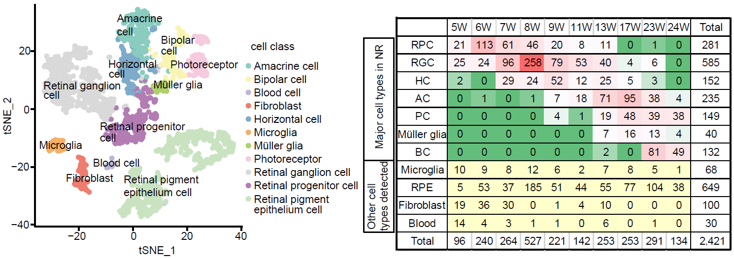 眼睛是心灵的窗户,而视网膜可以将外界的光转化为神经信号,是眼睛实现感光功能非常重要的组成部分。视网膜内层是神经层(主要包含视杆细胞、视锥细胞、双极细胞、无长突细胞、水平细胞、神经节细胞和缪勒细胞等),外层是色素上皮层(如图2所示)。目前,已有大量的基于小鼠模型的研究揭示了视网膜神经层和色素层的发育路线。但是,人类视网膜神经层和色素层发育的分子机制以及这两层结构中的细胞间的相互作用关系尚未明确。该课题组对来自人类胚胎5周到24周的视网膜神经层和色素上皮层(RPE)的2400多个细胞进行了高精度单细胞转录组测序分析。主要发现有: