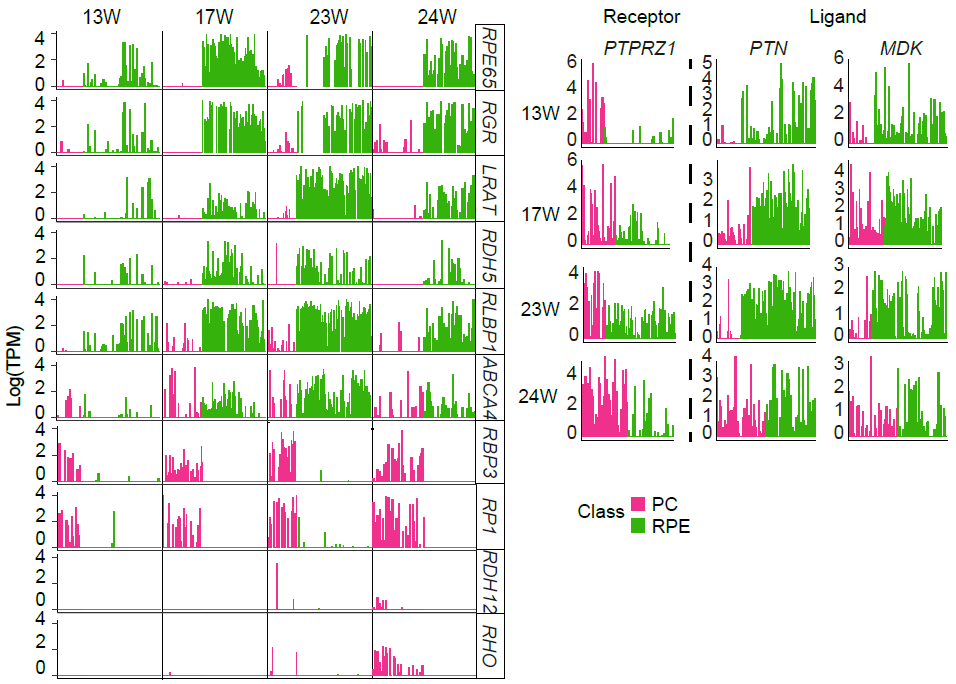 该研究提供了RPE细胞与光感受细胞相互作用的诸多线索(如图6所示)。成体的视网膜中,RPE细胞与光感受器细胞共同参与视循环-光转导通路。有报道称光转导始于视紫红质吸收光子。在人类胚胎发育过程中,直到第24周,光感受器细胞中才第一次检测到视紫红质基因的表达。然而在视网膜色素细胞中,第13周的时候就可以检测到一系列与视循环相关基因的表达。上述结果说明,胚胎发育的第13周,视网膜已经开始视循环,远远早于光转导的发生。该研究还检测到了成对的受体与配体基因在RPE细胞和光感受器细胞中的表达,这也为研究两种细胞的相互作用提供了重要线索。