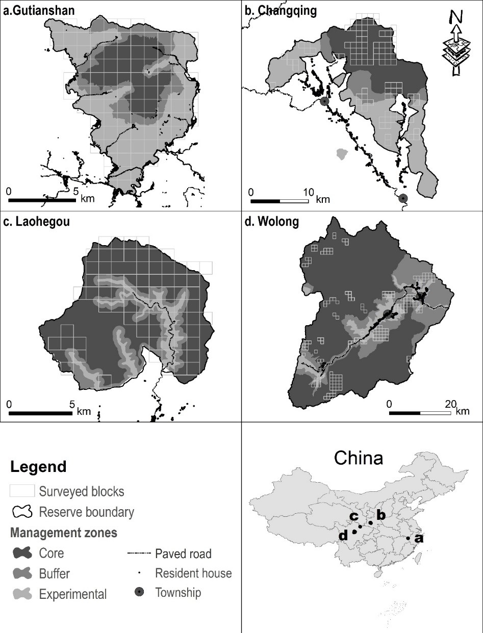 图2. 4个自然保护区的管理分区与本研究红外相机调查网格