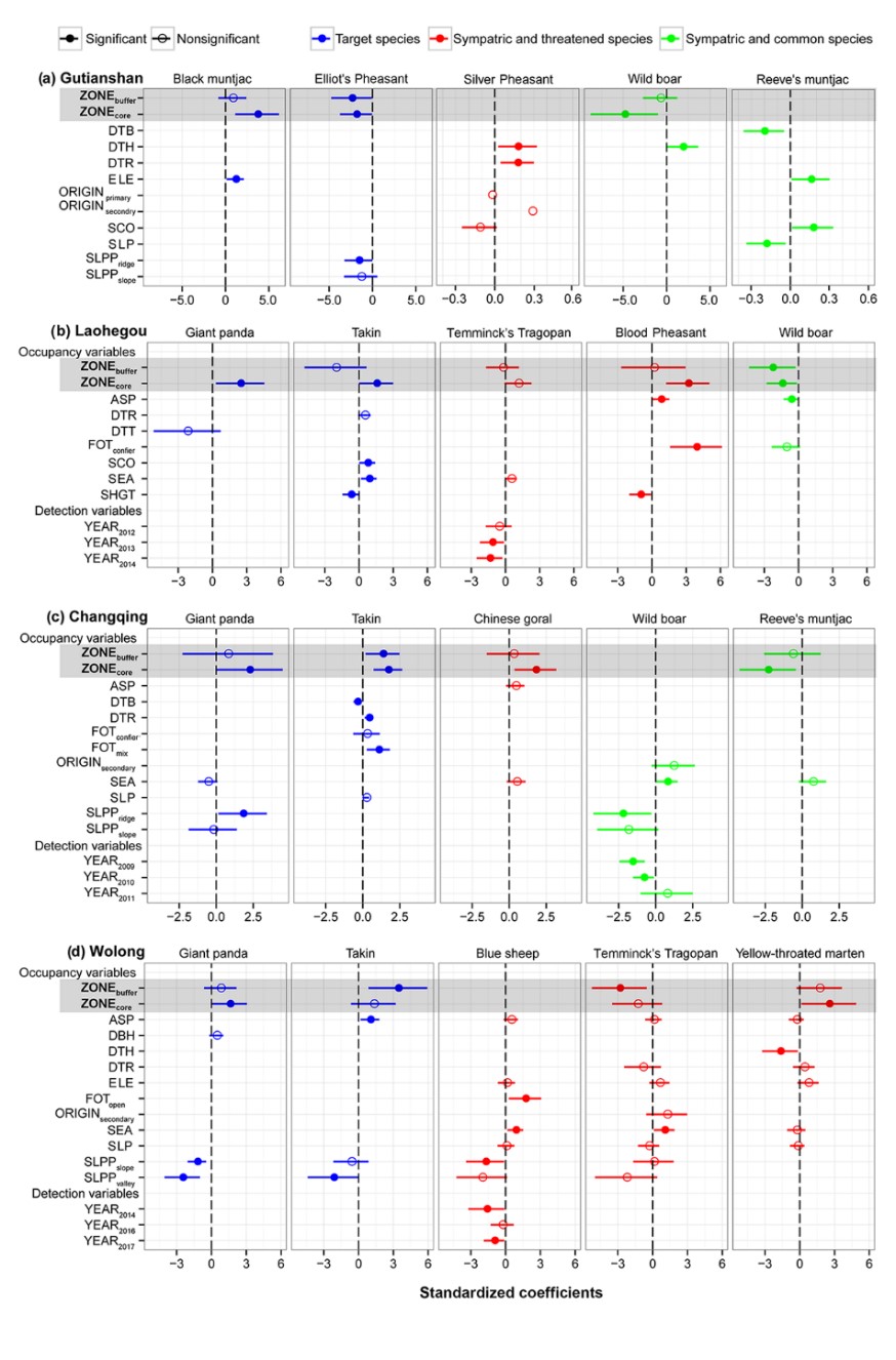 为解决这一问题,李晟研究组与合作者选择浙江古田山、陕西长青、四川老河沟、四川卧龙4个具有代表性的野生动物保护区,系统评估了针对旗舰物种(大熊猫、羚牛、黑麂、白颈长尾雉)划定的管理分区对其它同域分布物种保护的有效性。研究人员与自然保护区合作,使用红外相机调查技术开展针对大型兽类和地栖雉类的系统调查,并在大量红外相机记录的基础上,综合运用占域模型、ENFA生态位模型等方法,分析了从保护区实验区向缓冲区、核心区过渡的过程中,主要保护对象及其它同域分布物种是否均表现出更强的选择利用。