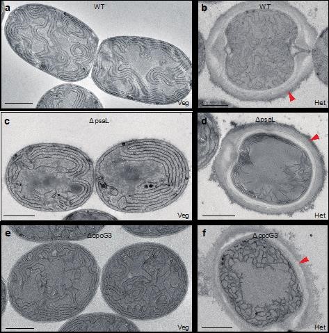 图2 PCC 7120营养细胞(Veg)和异型胞(Het)的类囊体膜组织图。敲除PsaL亚基的两类细胞的类囊体膜的都变得更加规则化。