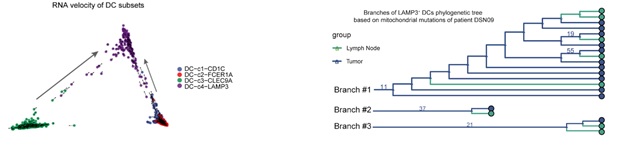 图2 左图:将肝癌组织中树突状细胞的RNA velocity的计算结果投射到在Diffusion Map坐标上,颜色代表不同的细胞群。右图:基于线粒体基因突变构建的LAMP3+ DC进化树