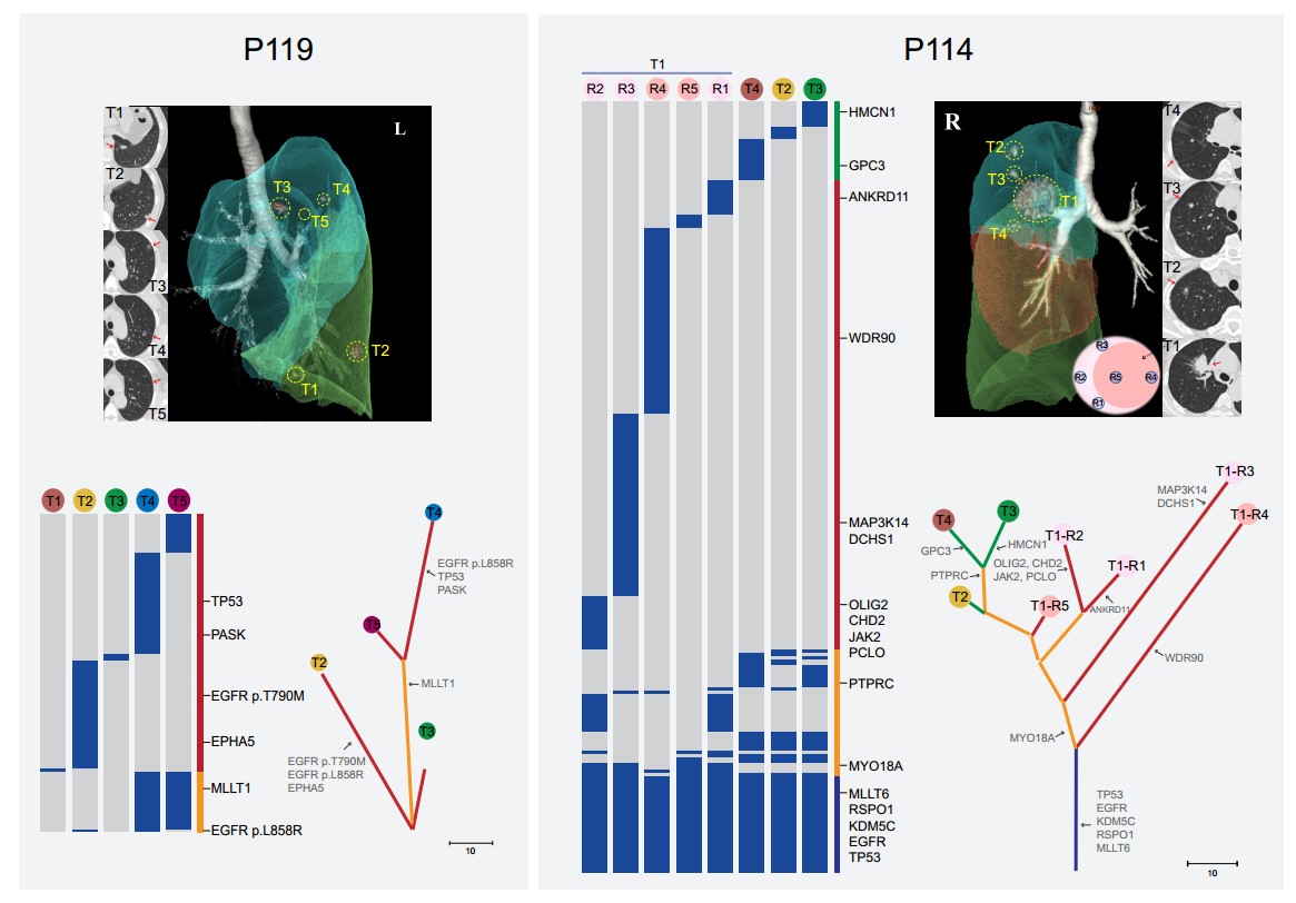 肺内亚实性结节患者中约20-30%拥有同期多发的SSN病灶,目前临床上普遍认为其各病灶为独立起源而非存在转移关系。该项目通过对26位同期多发SSN患者的66个病灶取样测序,进行多病灶间的克隆演化分析,大体证实同一患者内部的同期多发的SSNs的独立起源关系。不同寻常的是,作者还鉴定出非多中心起源的演化关系(图3),此结果提示,即使普遍认为较为惰性的表型为SSN的早期肺腺癌病灶也有可能具备转移能力,将引发临床上对肺腺癌临床决策的进一步思考。此外,作者还采用同一病灶多区域取样的方法研究SSN内部不同组分的差异,发现SSN呈现很大程度的灶内异质性和分支演化的特征。