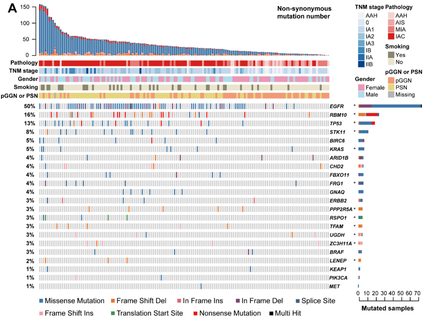 图1,综合外显子测序方法和临床参数测量统计揭示肺内亚实性结节的基因组突变和临床表型特征