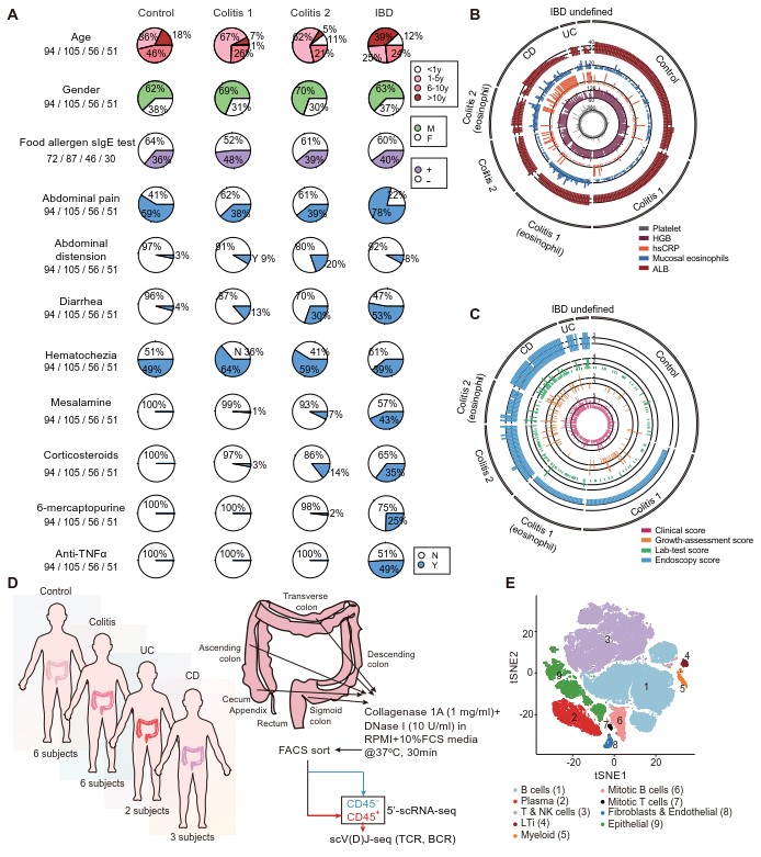 研究团队回顾了2016 ~ 2019年广州医科大学附属广州市妇女儿童医疗中心消化内科招募的306名患儿,并根据临床、生化检验、内镜和组织病理学等评分将患儿分为对照、结肠炎(colitis),溃疡性结肠炎(UC)和克罗恩病(CD)组。结肠炎又分为轻(分级1)、中(分级2)、重度(分级3)三个等级。肠镜时,中-重度结肠炎及UC和CD患者的血红蛋白(HGB)和白蛋白(ALB)显著降低,而超敏C反应蛋白(hsCRP)和血小板计数则升高(图1A-C)。为了阐述致病机制及研究药物靶点,研究团队对17名患儿(包括对照组及PIBD各亚型)的结肠黏膜进行了单细胞转录组及TCR+BCR分析,并将中国儿童的风险基因与各细胞亚型的转录特征进行了关联(图1D-E)。