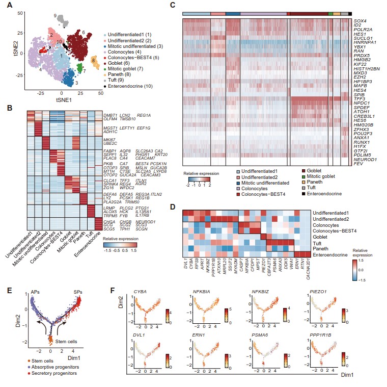 单细胞测序将肠上皮细胞分为了10个亚群,风险基因富集在不同的细胞亚群上,发挥的功能不尽相同(图2)。比如CASP7可能引起肠上皮(coloncytes)凋亡; DVL1可能通过catenin/WNT通路影响上皮细胞的再生;表达在Goblet细胞上的离子通道PIEZO1可能对周围的力学环境比较敏感(图2D-F)。这些蛋白的失调最终可能促进儿童结肠炎及炎症性肠病的发生发展。