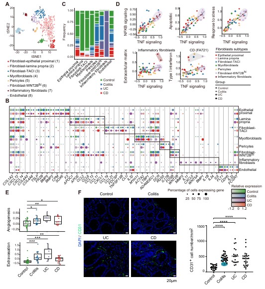 结肠黏膜成纤维细胞和血管内皮细胞共有8个亚群(图3A)。PIBD的肠黏膜含有大量WNT2B高表达和炎性成纤维细胞,这些细胞富集TNFα, NF-κB和压力应答等通路,其中炎性成纤维细胞只在UC中富集(图3B-D)。PIBD中的成纤维细胞分泌更多的能招募并活化髓系细胞的CCL和CXCL家族趋化因子(图3B)。研究团队还发现疾病组的血管生成以及免疫细胞跨内皮迁移增加(图3E-F)。