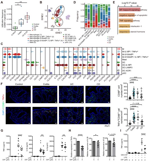 CD68+的髓系细胞在PIBD中,尤其是UC和CD患者中的浸润显著增加(图4A),且高表达IL1β和TNFα的巨噬细胞几乎只存在PIBD中,这类细胞中行使降解胞内cAMP功能的磷酸二酯酶4B(PDE4B)表达升高(图4B-F)。抑制PDE4B可以降低炎症因子的释放,研究团队通过体外细胞实验证实靶向PDE4B的临床药物双嘧达莫可以显著抑制TNFα,IL1β和IL6的释放(图4G-I)。