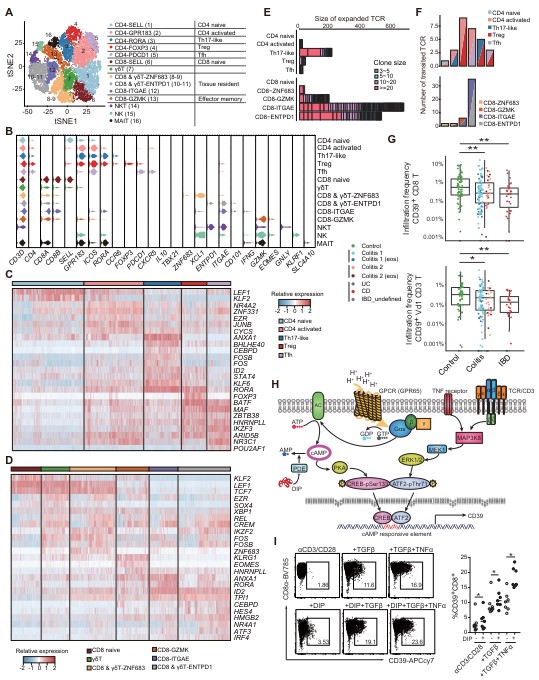 结合单细胞测序和免疫细胞表型分析,研究团队描述了不同T亚群的克隆扩增及转化情况(图5A-F)。值得关注的是,细胞表面表达的核酸外切酶CD39在CD8+和Vδ1+T细胞的表达在PIBD各亚型中显著降低(图5G)。CD39受cAMP-PKA-ERK-ATF2/CREB调控,可以降解胞外的ATP和ADP,研究团队证实CD39表达缺失确实会导致肠黏膜ADP浓度增加,从而激活血小板促进5-羟色胺的释放,最终诱导黏膜损伤;也通过体外细胞实验证实了靶向PDE4B的临床药物双嘧达莫可以提高Navie CD8+T细胞的CD39表达(图5H-I),这与单细胞转录组分析及过往报道提示提高cAMP可能促进CD39的表达相符。
