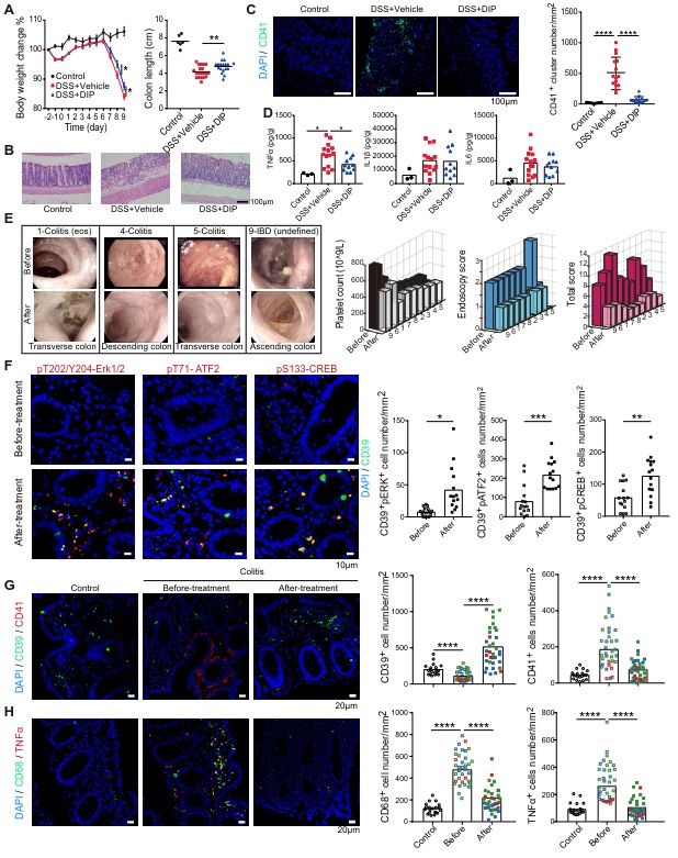 为了证实第二信使激动剂在治疗PIBD的应用潜力,研究团队利用腹腔注射双嘧达莫的方式对硫酸葡聚糖(DSS)诱导的急性肠炎小鼠进行了治疗,发现双嘧达莫可以显著改善小鼠的体重、结肠长度和结肠的组织病理结构,抑制小鼠结肠黏膜的血小板聚集和TNFα的释放(图6A-D)。对9例患儿(8例结肠炎和1例未定型IBD)开展了双嘧达莫的小队列临床试验,发现患者的血小板计数,结肠镜评分和临床综合评分均有明显改善(图6E)。其可能的机制是双嘧达莫通过cAMP-PKA-ERK-ATF2/CREB途径提高CD39的表达,从而抑制血小板的聚集和活化(图6F-G);同时,该药可以抑制CD68+髓系细胞及TNFα的释放(图6H),最终缓解临床症状。