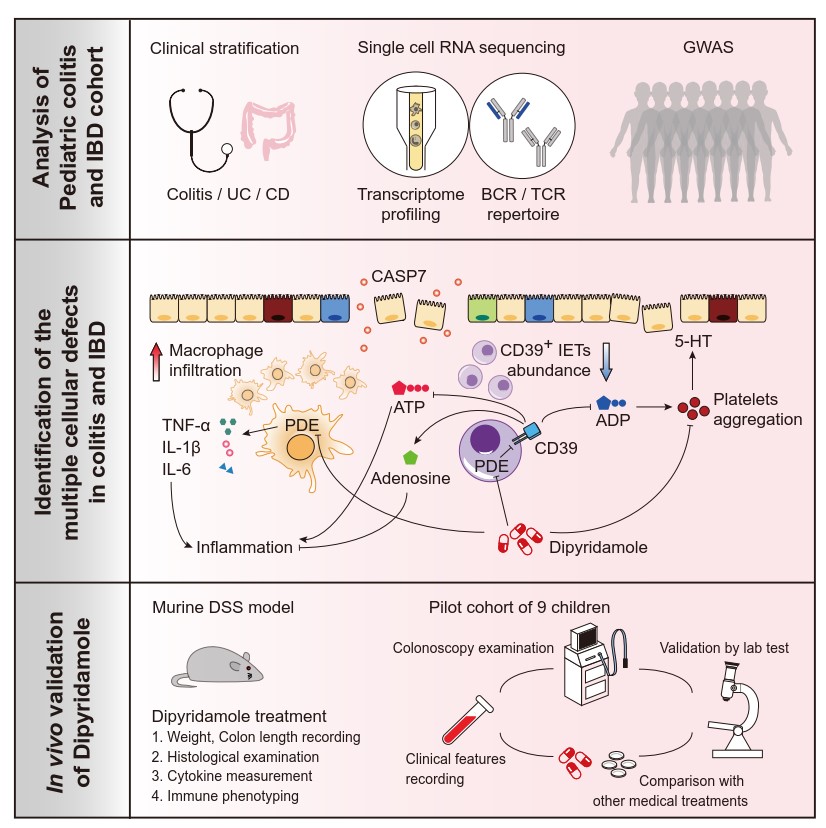 研究团队利用深度免疫分型并结合单细胞转录组测序技术、全基因组关联分析(GWAS)、体外、动物实验和临床测试,揭示了结肠炎和炎症性肠病患儿肠黏膜多个细胞亚型中的cAMP通路被抑制,从而导致级联免疫紊乱并最终促进了PIBD的发生发展(图7)。本文还发现了胞内第二信使激动剂双嘧达莫可以提高cAMP,增加CD39的表达,抑制炎性因子分泌和血小板活化,从而为儿童结肠炎及炎症性肠病的防治开拓了新的领域(图7)。未来,此类药物可能会成为儿童和/或成人胃肠炎症疾病的另一种临床防治选择,有助于降低医疗成本,促进社会和谐。但是因临床环境较为复杂,潘生丁的使用需要继续进行临床实验。具体用药请咨询临床医生。