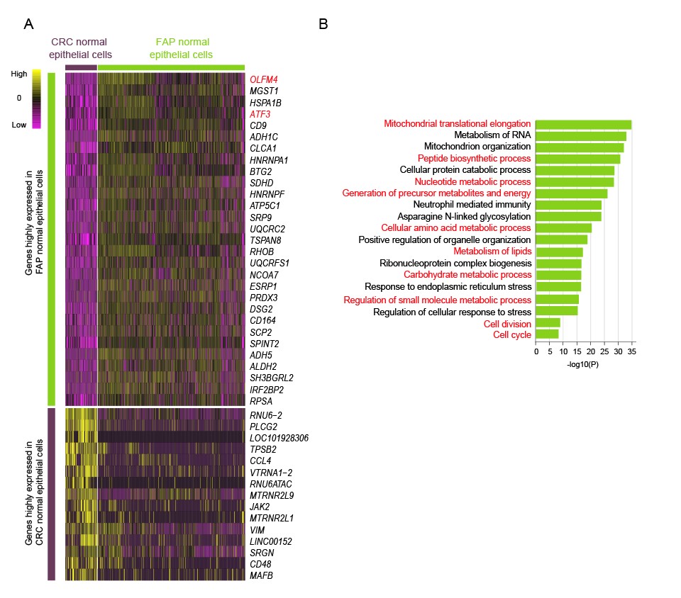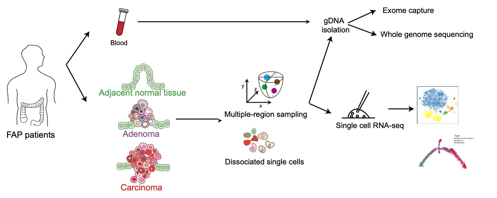 结直肠癌在全球范围内是发病率第三、致死人数第四的恶性肿瘤(Beattie et al., 2005)(Carey, 2017; Church, 2016)。结直肠腺瘤是结直肠癌的癌前病变,根据组织学形态可以分为低级别腺瘤和高级别腺瘤,从低级别腺瘤到腺癌的序列发生需要10年以上时间。因此,深入解析低级别腺瘤向腺癌转化的分子机制对于结直肠癌的预防、早筛和治疗都有重要意义。家族性腺瘤性息肉病(Familial adenomatous polyposis, FAP)约占全部结直肠癌的1%,FAP的遗传与APC抑癌基因密切相关,APC基因的胚系突变启动了大肠癌沿正常粘膜—低级别腺瘤—高级别腺瘤—癌的多阶段多步骤发生模式, 如不及时肠镜下切除息肉或者手术切除相应肠管,息肉癌变率可高达90%以上。FAP患者体内存在大量的起始于同一APC基因突变的处于不同演进阶段的结直肠肿瘤性病变,即同一个体体内同时存在正常上皮、不同级别腺瘤、早期癌、进展期癌等不同病变。同时,这些肿瘤性病变具有相同的遗传背景,面临相同的致癌因素和选择压力(Bodmer et al., 1987; Groden et al., 1991; Kinzler et al., 1991; Nagase and Nakamura, 1993; Rengifo-Cam et al., 2016)。这为研究结直肠腺瘤的癌变过程提供了非常好的研究材料。