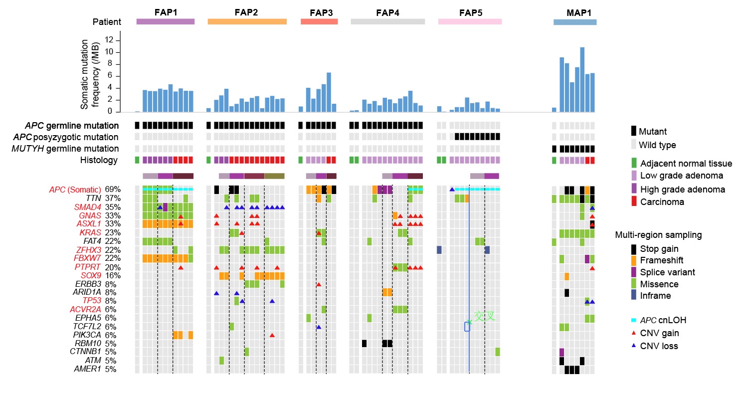 1. 在单个病人的水平上探究了正常上皮向腺瘤以及腺癌发生过程中的基因组变异情况。该研究通过比较来自于同一个患者的不同病变阶段的腺瘤和腺癌组织,发现即使是低级别腺瘤,其体细胞突变的数目相对于癌旁组织已经明显升高。特别是,良性的高级别腺瘤的体细胞突变数目甚至可以比恶性腺癌的体细胞突变数目还高。出现频率最高的潜在体细胞致病突变是抑癌基因APC基因的二次失活突变(同一个细胞中另外一个野生型APC等位基因的失活突变)(69%),此外,不同患者在其他潜在的致病基因的突变谱上表现出了强烈的个体间异质性。