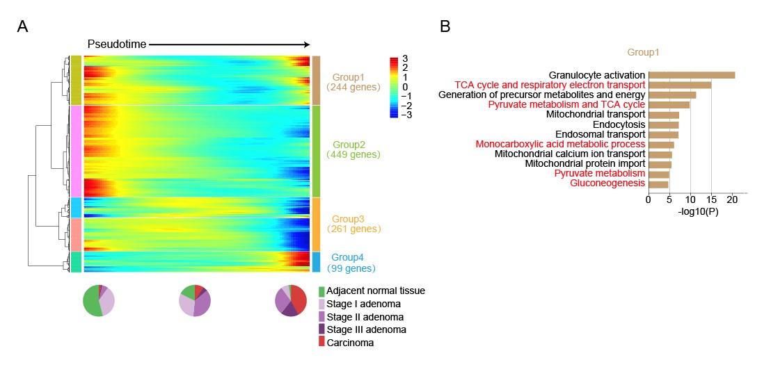 图5. (A)将随拟时间动态变化的基因按照其动态变化趋势聚类。(B)对第一类基因做GO分析。