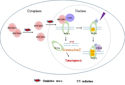 郑晓峰课题组发表在PNAS的研究鉴定了一个新的PCNA相互作用蛋白HSCARG。HSCARG能够增强USP1/UAF1复合体对PCNA的去泛素化活性,并进一步导致TLS通路的失活,双链断裂的形成和突变的累积。生物信息学分析以及免疫组化和乳腺癌模型小鼠相关表型实验结果一致表明,HSCARG在乳腺癌组织中存在着高表达现象,敲除内源的HSCARG能够减缓乳腺癌的自发形成。HSCARG本身在胞内的调控功能又受到细胞氧化还原状态的影响,当细胞在氧化压力下,HSCARG由二聚体解离为单体,由细胞质进入细胞核,上述变化增强了HSCARG对TLS通路的调控效率。