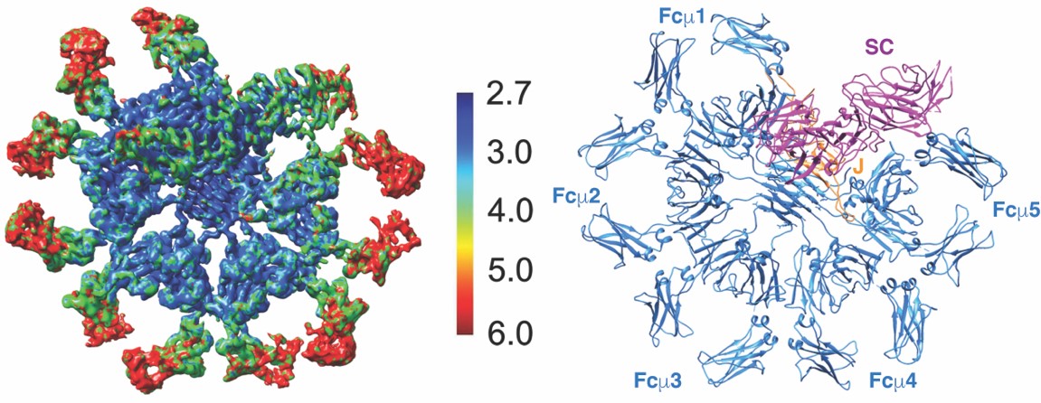 图1. 人源IgM-Fc/J链/分泌组份复合体的冷冻电镜结构。