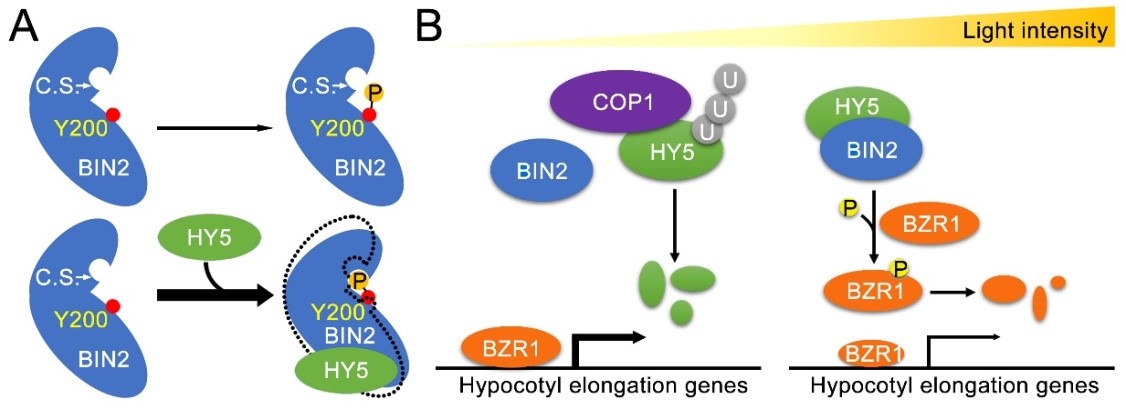 光是植物赖以生存的能量来源与关键生长发育信号。模式植物拟南芥幼苗在光下呈现短胚轴、子叶延展等典型特征。近二十年的研究工作构建了以HY5 (ELONGATED HYPOCOTYL 5) 为中央枢纽的光信号转导网络,奠定了HY5作为转录因子的“明星”地位。近期邓兴旺实验室朱丹萌课题组研究发现HY5在光下还可通过蛋白-蛋白直接互作增强BIN2 (BRASSINOSTEROID-INSENSITIVE 2) 的激酶活性,抑制幼苗下胚轴伸长。
