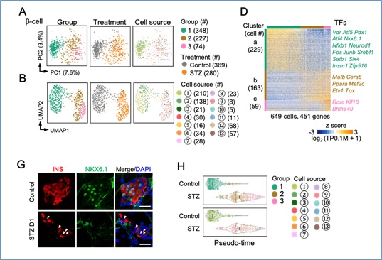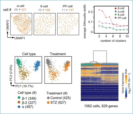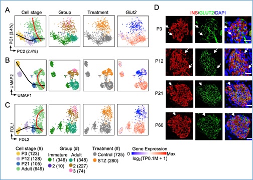 STZ诱导的小鼠糖尿病模型(图1)被广泛应用于糖尿病以及β细胞再生领域的研究。然而,目前对于该模型中胰岛细胞的状态以及分子特征了解十分有限。该研究利用单细胞转录组测序技术得到STZ处理后的不同时间胰岛细胞的转录组,并与未处理的胰岛细胞进行比较分析。结果显示,未处理的β细胞在转录组上存在异质性,绝大部分为Glut2高表达细胞(Glut2high)以及一小部分 Glut2低表达细胞(Glut2low)组成。单次大剂量STZ处理后,Glut2high 细胞大量凋亡,Glut2low 细胞存活下来并且转录组发生进一步改变(图2)。除了鉴定出生理及病理状态下β细胞转录组的异质性,该研究还解析了Glut2low细胞的分子特征,发现病理状态下这类β细胞在功能缺失的同时自身代谢发生紊乱,与糖尿病患者β细胞的分子特征具有一定的相似性。这些分子特征不仅可以作为β细胞功能缺失的分子标记,更为糖尿病药物筛选提供可能的靶点。
