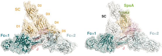 由于SIgA在黏膜免疫防御系统中的重要作用,许多致病菌演化出破坏其功能的机制。肺炎链球菌(Streptococcus pneumoniae)是一种革兰氏阳性菌,能够引起中耳炎、肺炎、脑膜炎等疾病。肺炎链球菌黏附素SpsA(S. pneumoniae SIgA binding protein, 也被称为CbpA、PspC)能够结合SIgA而影响其对细菌的清除功能。SpsA也可以结合游离的pIgR/SC,这种结合可能会增强细菌的粘附性,并帮助其入侵细胞。SpsA如何选择性识别人源pIgR/SC还有待研究。