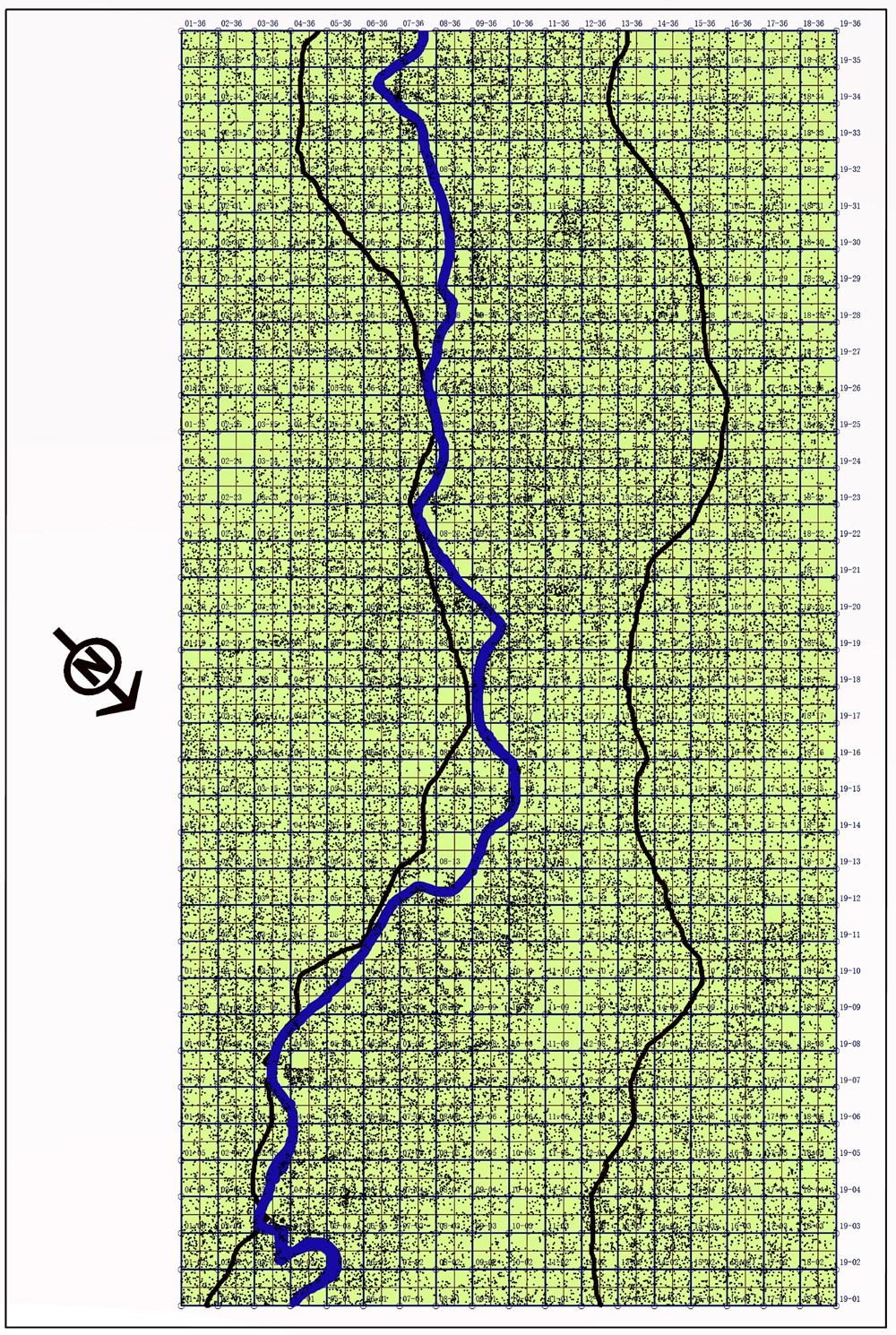 王朗样地挂牌树木植株的空间分布(蓝色线条为纵贯样地的河流,黑色线条为河谷平地两侧的坡基线)