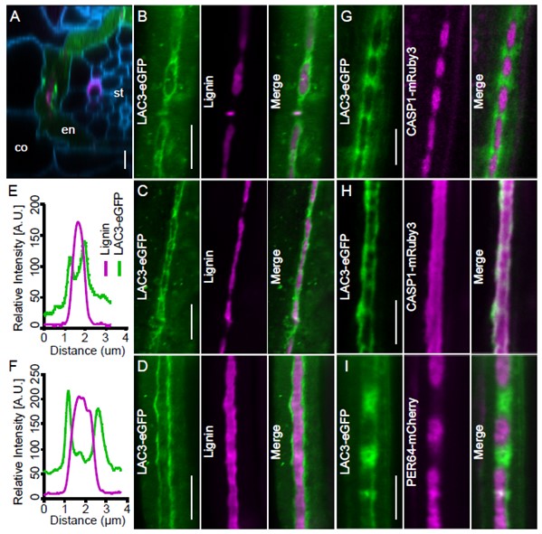 为解答上述问题,研究者通过基因表达谱发现漆酶基因LAC3特异表达在内皮层细胞。利用proLAC3::LAC3-eGFP转基因报告材料,发现LAC3在凯氏带发育的整个过程中都围绕着CASP表达域以及木质素域(图1)。运用化学遗传方法抑制漆酶表达后,研究者发现凯氏带变得更加弥散且在靠近皮层一侧出现依赖SGN3通路的异位木质素沉积,同时发现CASP1的定位也失去清晰边界而变得更加弥散。以上结果提示LAC3可能在胞外确定凯氏带的位置信息,与CASP蛋白相互配合,从而指导形成极性定位的凯氏带结构。