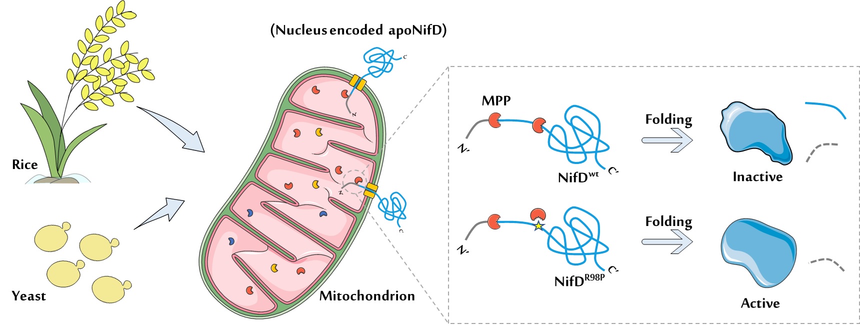 配图:固氮酶核心酶组分NifD蛋白及其稳定突变体在酵母及植物线粒体中定位表达示意图。野生型NifD(NifDwt)蛋白中由于存在一个天然的疑似内在线粒体信号肽酶(Mitochondrial-Processing Peptidase, MPP)切割位点,而被错误切割,从而导致其无法正确折叠;而NifD-R98P(NifDR98P)等突变体通过对NifD蛋白天然切割位点的突变限制了MPP酶的切割,从而保证了NifD蛋白的正确折叠。