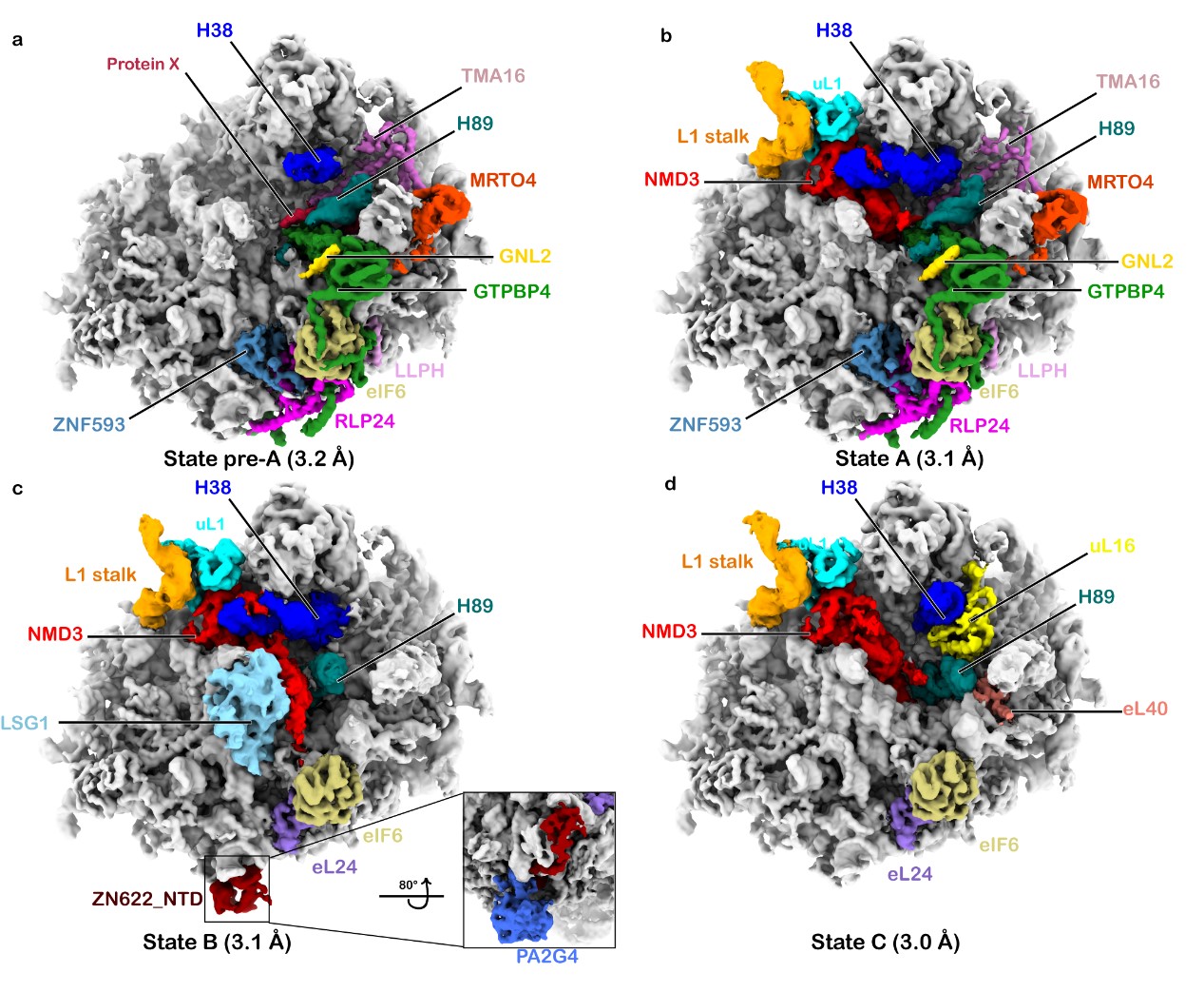本研究以人源大亚基的出核转运接头蛋白NMD3为诱饵,通过在其C端加入亲和标签纯化出了一系列出核前后的大亚基组装前体内源复合物,并通过冷冻电镜解析了四个不同前体复合物的高分辨率结构。在这四个结构中发现了十余个人源组装因子,包括NMD3,GTPBP4,LSG1、EIF6,MRTO4,ZNF622,ZNF593,LLPH,RLP24,GNL2,TMA16,PA2G4及一个未知蛋白protein X,为进一步研究这些因子准确的分子功能和机制提供了结构基础。例如,TMA16是一个保守的蛋白,但并未在之前发表的酵母大亚基前体复合物中发现,表明核糖体组装过程中蛋白因子的结合时可能受到精密的调控。再如,PA2G4(Ebp1)具有不同的剪切形式,是一个多功能的蛋白因子。以往研究表明PA2G4在几种肿瘤的发生发展中参与了ERBB3调控的信号通路。本项研究和德国Spahn组尚未正式发表的PA2G4结合翻译过程中的80S核糖体的研究工作 (Kraushar et al., 2020)则表明此因子至少在核糖体的组装和蛋白质的翻译中都具有明确的分子功能,暗示之前的工作有可能并不是直接效应。