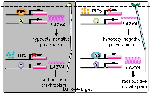 陈浩东课题组的研究发现,黑暗环境中,抑制光形态建成的转录因子PHYTOCHROME INTERACTING FACTORS (PIFs) 能直接结合到重力信号正调控因子LAZY4基因的启动子上并激活其表达,使植物的胚轴在暗中能维持很好的负向重力性,利于其向上生长突破土壤;见光后,PIFs蛋白迅速降解,LAZY4表达量下降,胚轴的负向重力性变差。在根中,促进光形态建成的转录因子ELONGATED HYPOCOTYL5 (HY5) 可以直接结合到同一个靶基因LAZY4基因的启动子上并激活其表达,从而促进根的正向重力性,有利于根向下扎得更深。总结起来,该研究揭示了光通过两组不同的转录因子,器官特异性地调控重力信号因子LAZY4基因的表达,抑制胚轴的负向重力性却促进根的正向重力性的机制。