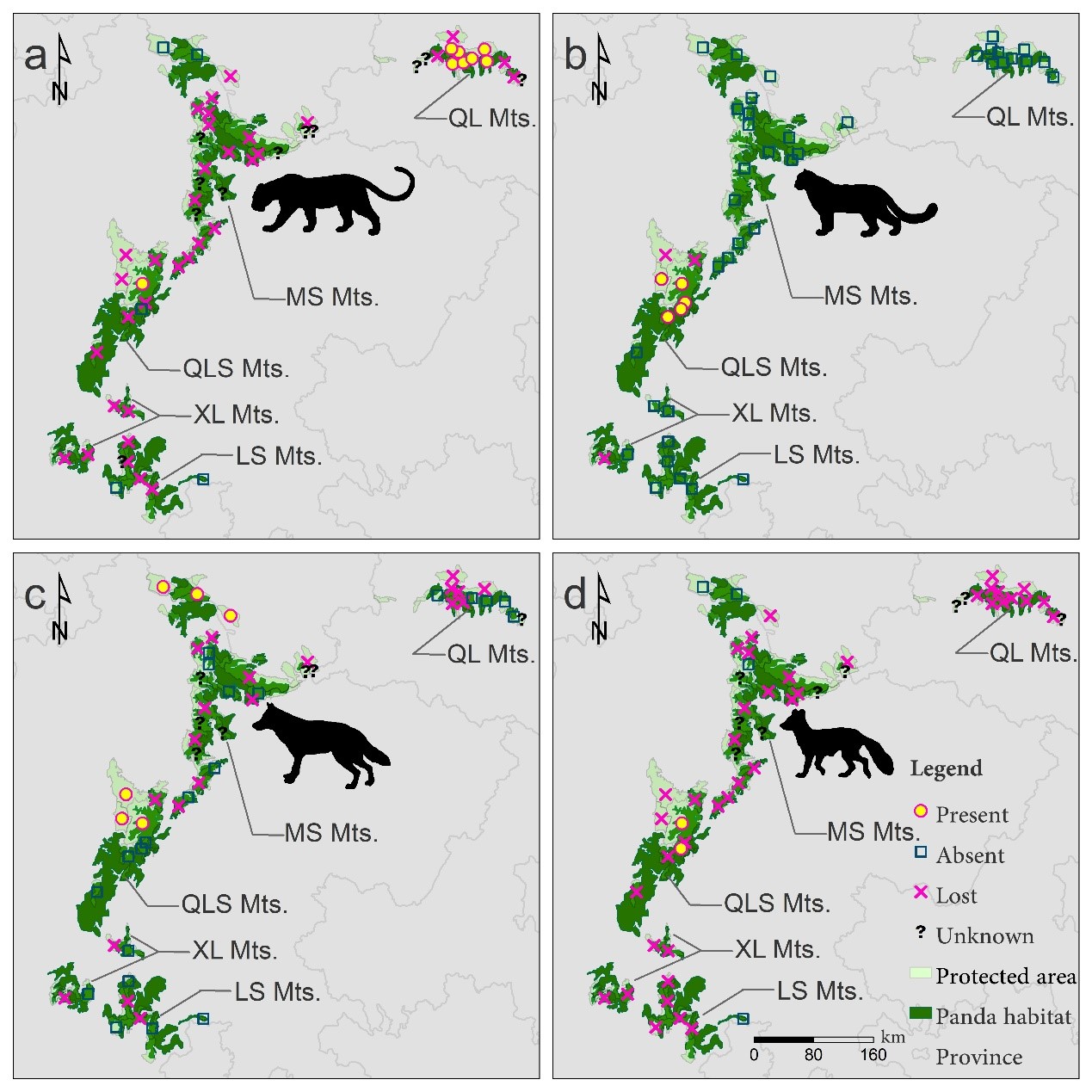 大熊猫的保护同时对许多与其同域分布的野生动植物物种有伞护作用,有效保护大熊猫栖息地也将促进这些同域分布物种的种群恢复。该研究针对同域分布物种中栖息地需求较为特殊的一个类群,大型食肉动物,试图回答针对大熊猫的保护行动是否能够满足同域分布的大型食肉动物种群的保护需求。研究系统收集了2008-2018年间大熊猫分布区内73个自然保护地(包括68个自然保护区、3个林场、2个社区保护地)的红外相机监测数据,评估了该区域内大型食肉动物在当前的分布现状。同时,与上个世纪中期以来各研究物种在保护地的历史分布数据相比较,系统评估了这些物种在这期间的分布范围变化。红外相机监测数据覆盖了大熊猫分布区5大山系(秦岭、岷山、邛崃山、相岭、凉山),包括7830个红外相机监测位点,总监测工作量达169万相机日。