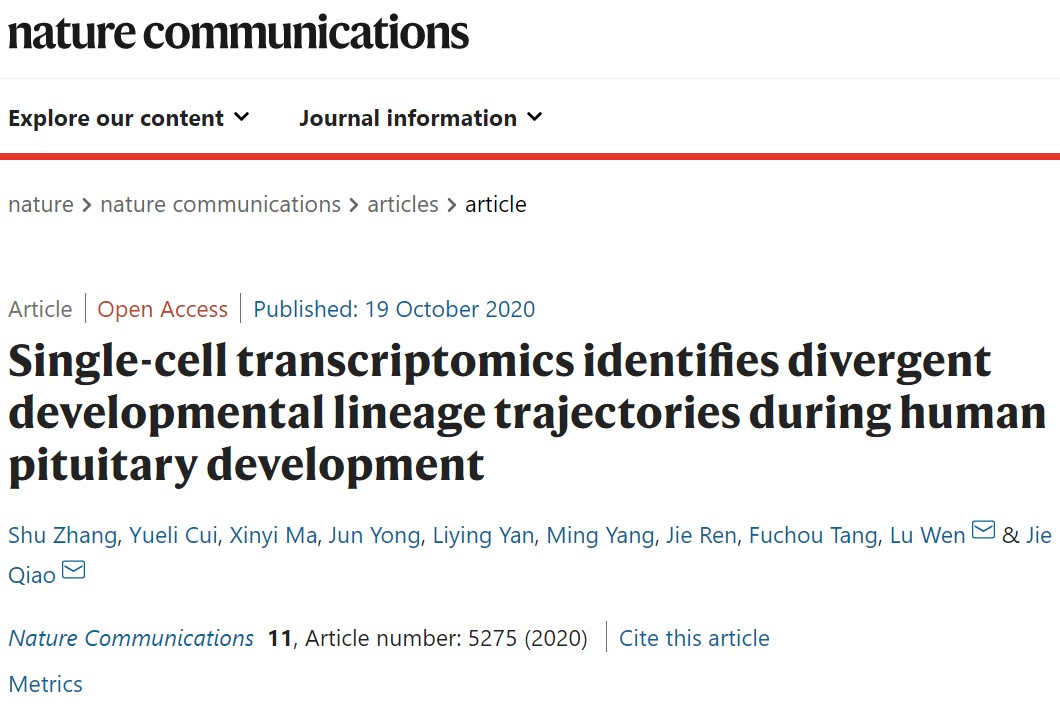 冰球突破mg正规官网、生物医学前沿创新中心(BIOPIC)与冰球突破mg正规官网第三医院合作,于2020年10月19日在国际知名学术期刊《Nature Communications》上在线发表了题为“Single-cell transcriptomics identifies divergent developmental lineage trajectories during human pituitary development”的文章。该研究利用单细胞转录组测序技术,揭示了7周至25周人类胚胎垂体中五种主要激素细胞的发育轨迹,定义了中间过渡细胞类型并发现了一个新的灵长类特异的促性腺激素细胞亚类,并阐明了垂体干细胞的状态变迁。