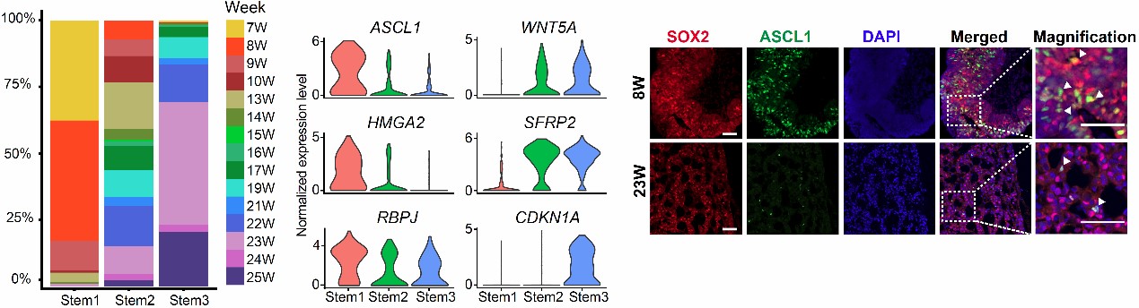 首先,研究人员对分子特征尚未研究清楚的人类垂体干细胞进行亚群特征鉴定,发现干细胞亚群随发育时间变化,早期干细胞增殖能力较强,且高表达垂体所有激素细胞分化必需的转录因子ASCL1,该基因对于早期干细胞分化可能发挥了重要作用。晚期干细胞增殖能力被抑制,且高表达WNT信号调节因子SFRP2和WNT5A。此外,相较于已分化的激素细胞,垂体干细胞同时高表达上皮的标志基因CDH1与间充质的标志基因VIM和CDH2,即处于混合上皮/间充质(hybrid E/M)状态,且与干性状态正相关,之前的研究表明该混合状态在小鼠器官发生和肿瘤转移中也发挥了重要作用5。