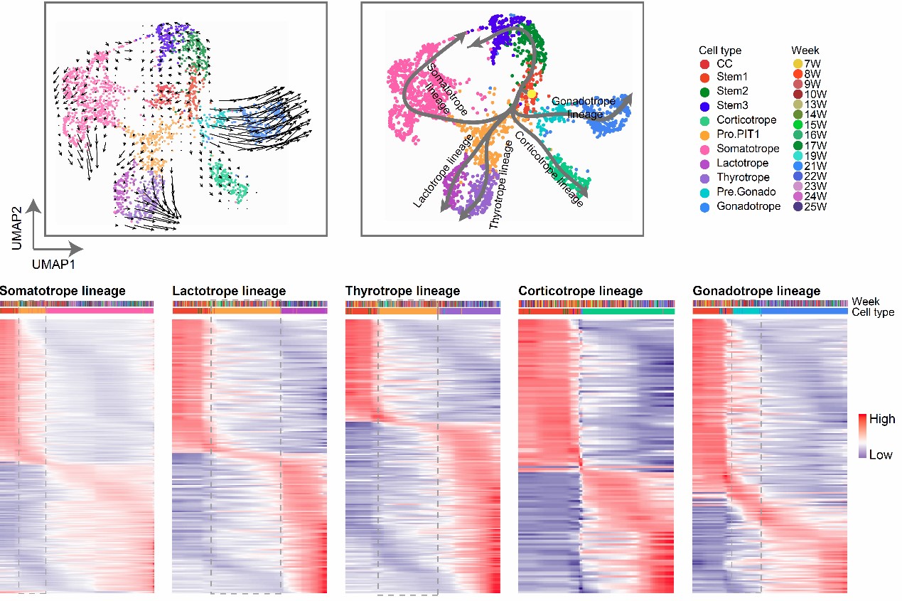 综上所述,这项研究绘制了首张人类垂体发育和胎儿垂体激素细胞单细胞转录组图谱,有助于寻找新的先天性垂体疾病致病基因,也为探索垂体功能低下的干细胞治疗提供了参照。