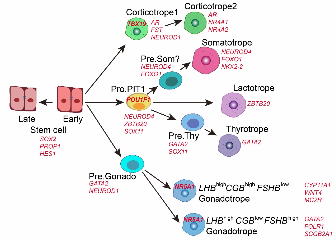 垂体是最重要最复杂的内分泌腺体之一,是内分泌信号转导的司令部,作为神经-内分泌系统中的主要成员,在维持机体内环境稳态中发挥关键作用。它位于大脑底部的蝶鞍中,重量不到1克,分为腺垂体和神经垂体两部分。腺垂体主要由五种激素细胞组成,包括生长激素细胞、催乳素细胞、促甲状腺素细胞、促肾上腺皮质激素细胞和促性腺激素细胞。这些细胞与下游靶内分泌腺之间构成复杂的信号系统,在生长发育、代谢调节、生殖以及应激等生理过程中发挥重要作用。垂体发育是一个精妙的过程。在人类胚胎第3周左右,腹侧间脑与原始口腔顶部外胚层接触,诱导其内陷形成一个微型囊状结构(Rathke囊),囊壁细胞通过分裂、迁移和分化,最终形成各种激素细胞类型。过去近三十年的小鼠遗传学研究已鉴定出许多信号途径(如BMP、FGF、WNT和SHH)和转录因子(如LHX3/4、PITX1/2、PAX6、HESX1、SOX2、PROP1、POU1F1(PIT-1)、GATA2、TBX19(TPIT)和NR5A1(SF-1))参与了垂体发育 ADDIN EN.CITE ADDIN EN.CITE.DATA 1-4。然而,我们对垂体发育过程所经历的各种细胞状态及其动态变化知之甚少;我们甚至缺乏对这些激素细胞类型或亚型基因表达谱的准确认知——因为常规转录组方法需要上万个细胞,检测到实际上是各种激素细胞类型的“平均细胞”。