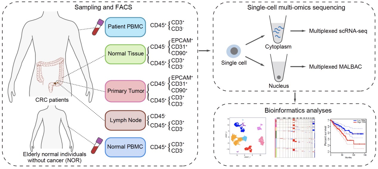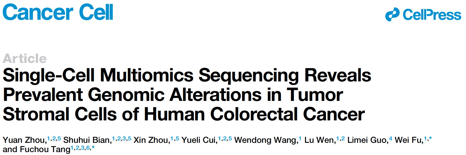 2020年10月22日,冰球突破mg正规官网、冰球突破mg正规官网生物医学前沿创新中心(BIOPIC)汤富酬课题组与冰球突破mg正规官网第三医院普通外科付卫课题组合作在国际知名学术期刊Cancer Cell上发表题为“Single-cell Multiomics Sequencing Reveals Prevalent Genomic Alterations in Tumor Stromal Cells of Human Colorectal Cancer”的研究论文。该研究从21例微卫星稳定的结直肠癌患者手术切除标本中获取了癌组织、淋巴结转移组织、癌旁组织以及外周血样品,同时从6例非癌症个体中获取了外周血样品,对多种非上皮细胞进行了高精度的单细胞基因组和转录组双组学测序。该研究首先建立并优化了一项单细胞基因组和转录组双组学测序技术,通过对单个细胞的细胞核和细胞质进行分离,使得对同一个单细胞能够同时进行转录组和基因组测序。并在此基础上系统地研究了肿瘤微环境以及正常组织中免疫细胞、成纤维细胞和血管内皮细胞中基因组拷贝数变异的发生频率和特征,揭示了肿瘤微环境中发生基因组拷贝数变异的成纤维细胞存在特异性克隆扩张现象;同时,通过单细胞转录组数据分析发现了5个肿瘤微环境中成纤维细胞特异性表达的肿瘤标志物,均与结直肠癌预后密切相关(图1,2)。