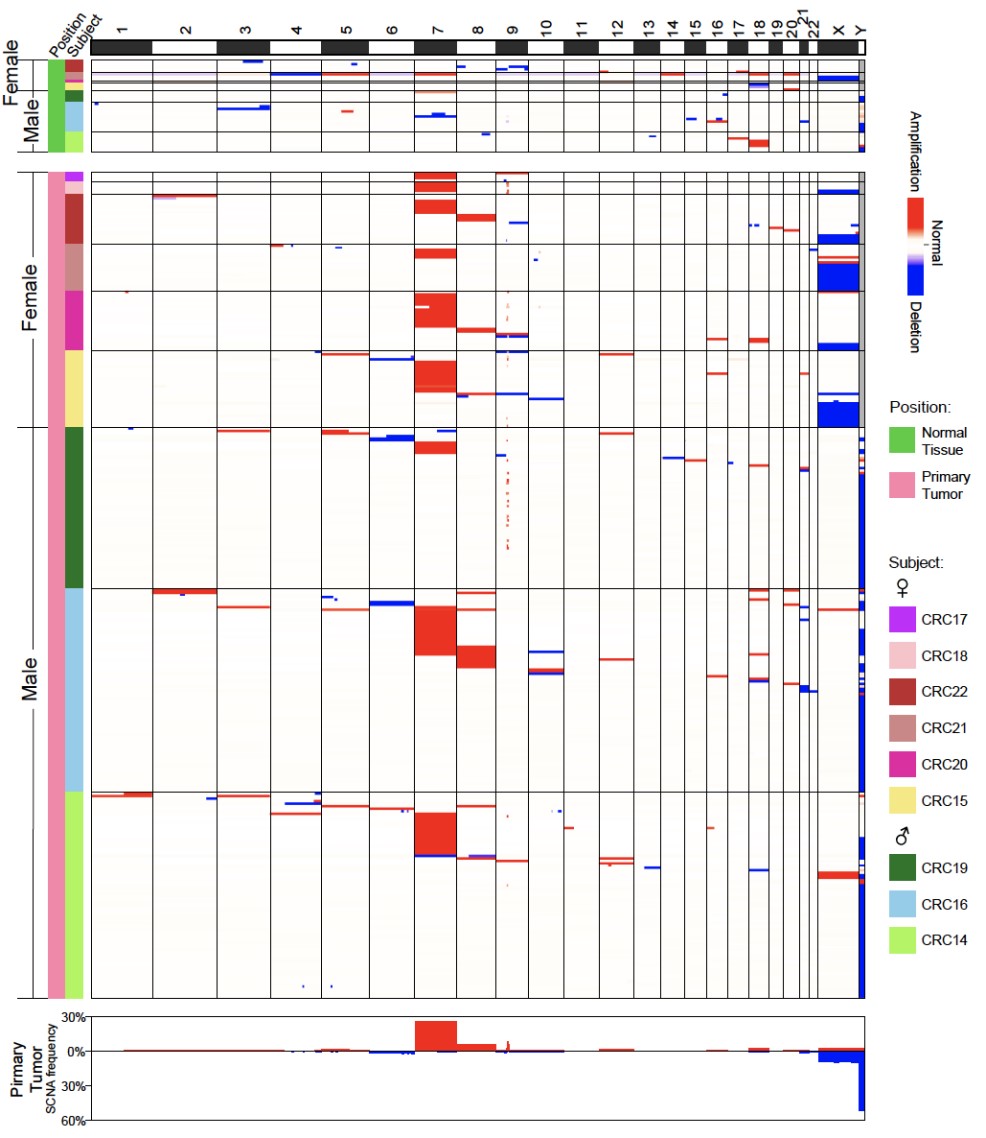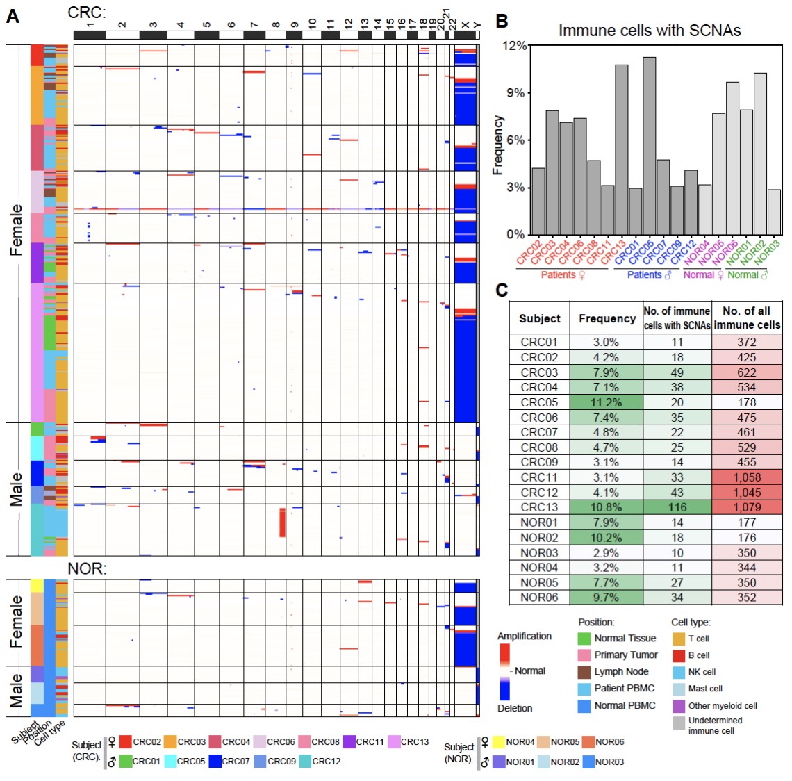通过单细胞基因组数据分析,研究人员发现不仅在肿瘤浸润免疫细胞中存在发生基因组拷贝数变异的遗传异常的免疫细胞(1.3%-11.2%),癌旁“正常”组织浸润的免疫细胞(0.9%-9.7%)、结直肠癌患者的外周血(1.1%-11.5%)以及未患癌症的个体的外周血(2.9%-10.2%)中都存在较高比例的遗传异常的免疫细胞。研究人员一共从8,982个通过严格基因组数据质控的免疫细胞中鉴定出538个(6.0%)发生基因组拷贝数变异的细胞。拷贝数变异在每一位结直肠癌患者(3.0%-11.2%)和每一位未患癌症的正常人(2.9%-10.2%)的免疫细胞中都普遍存在。通过研究发生拷贝数变异的染色体的分布,研究人员发现在女性个体中,整条X染色体的丢失发生频率最高(单个细胞中两条X染色体缺失一条,从XX变为XO),在男性个体中整条Y染色体的丢失发生频率最高(从XY变为XO),而常染色体的拷贝数变异似乎是随机分布的(图3)。有基因组拷贝数变异的血管内皮细胞在癌旁组织(0.0%-1.4%)、结肠肠系膜血管内皮(3.7%-14.9%)和癌组织(3.9%-12.8%)中也都普遍存在。